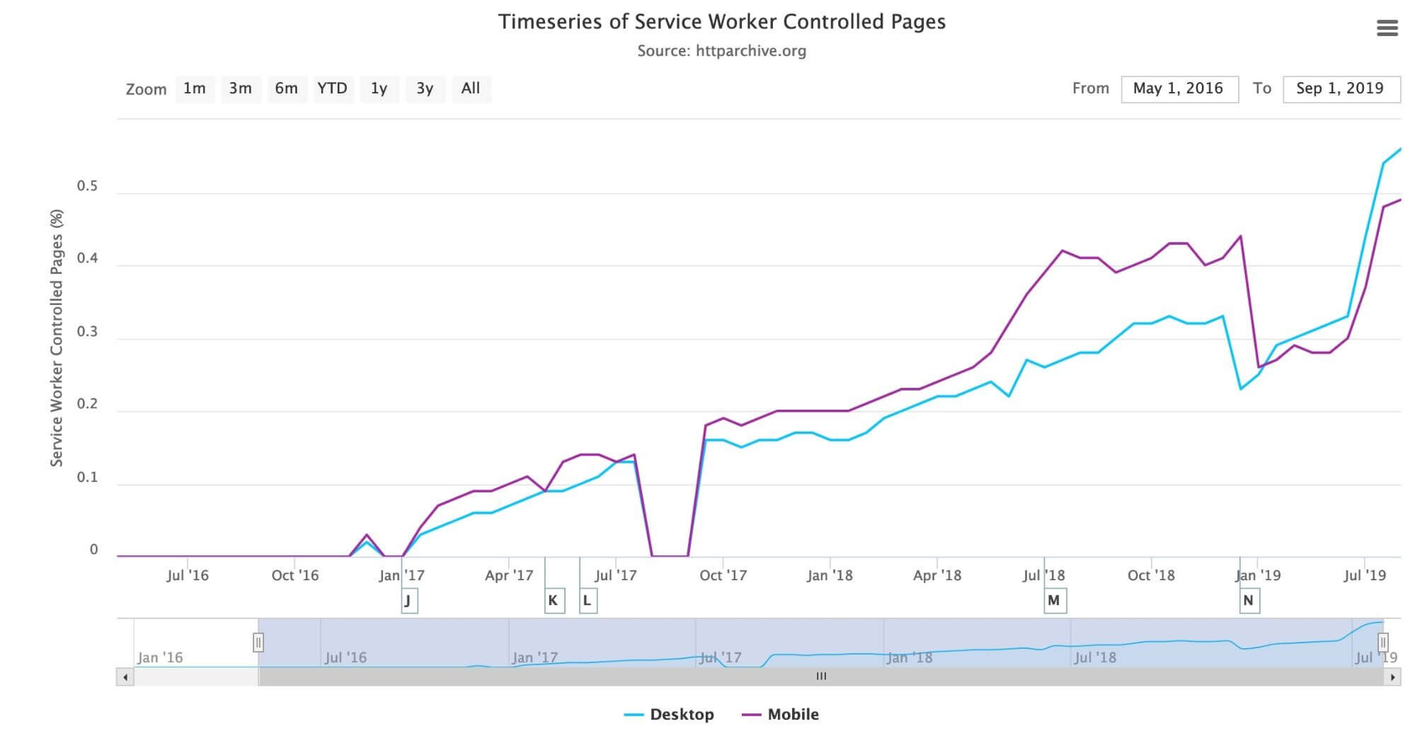 実際、HTTP Archiveトレンドレポートの1つは、以下に示すService Workerの採用を示しています。