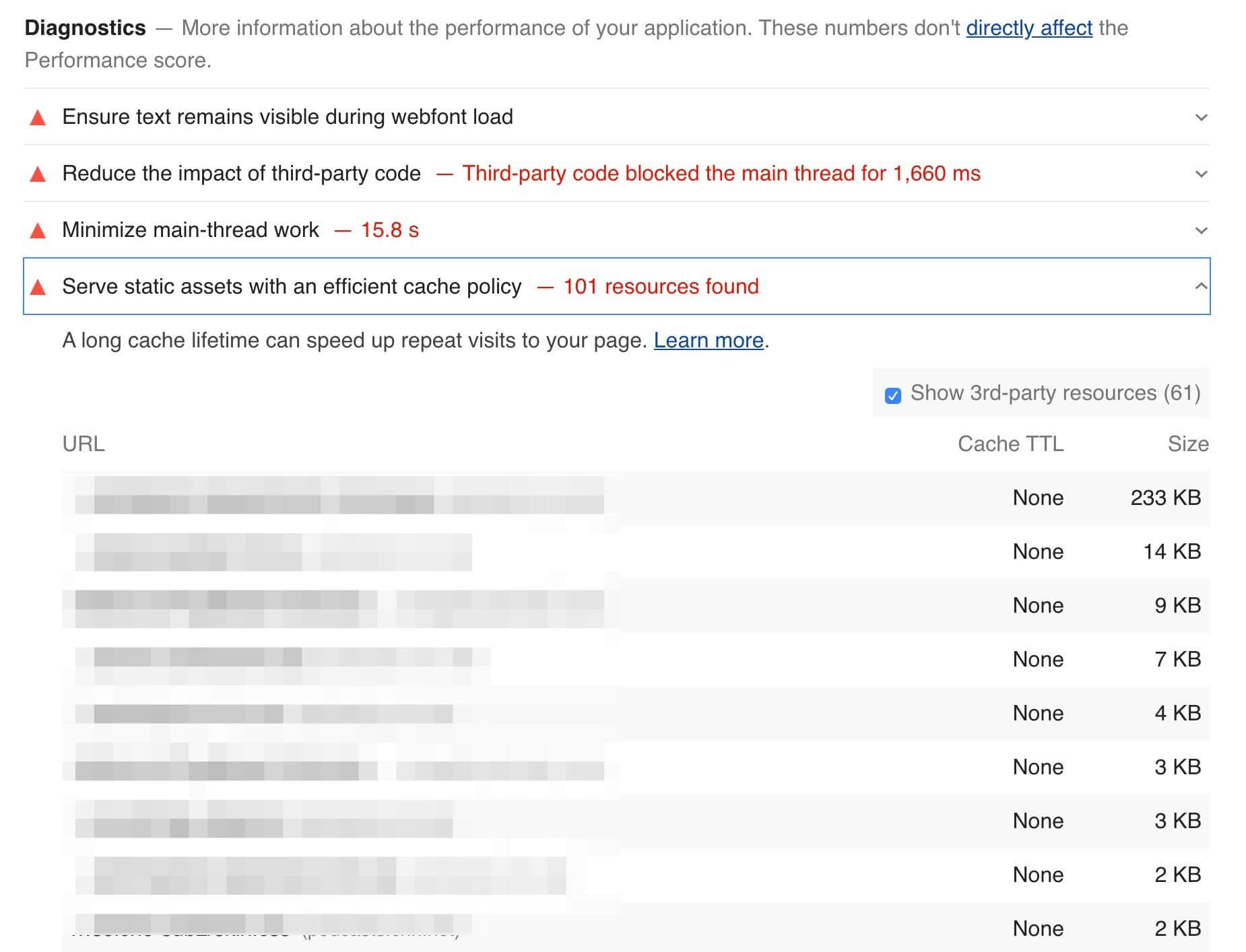 図16.20. キャッシュポリシーの改善の可能性を強調したLighthouseレポート。