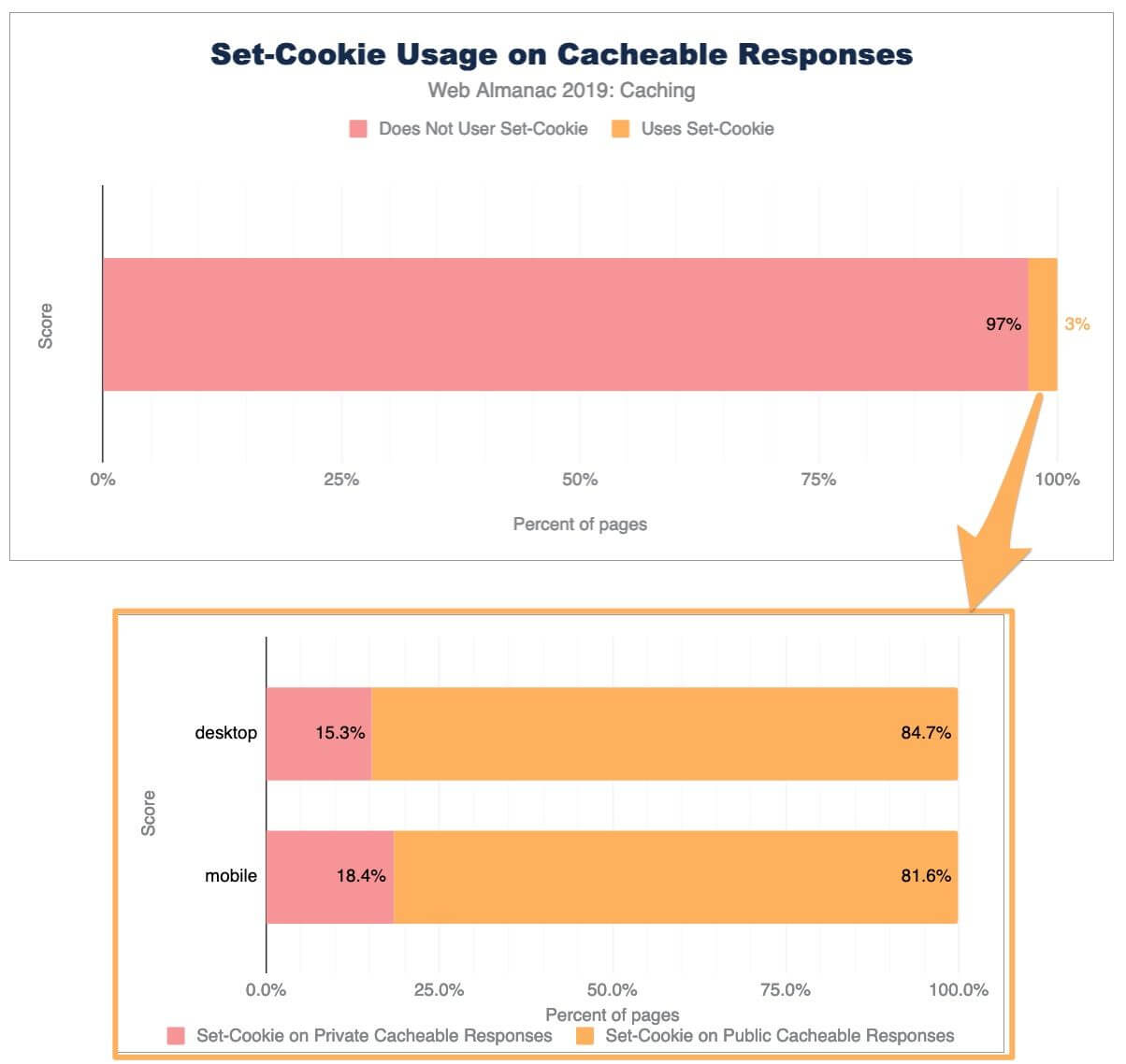 キャッシュ可能なレスポンスの3%にSet-Cookieヘッダーが含まれています。これらのレスポンスのうち、プライベートディレクティブを使用しているのは18%のみです。残りの82%には、パブリックおよびプライベートキャッシュサーバーでキャッシュできるSet-Cookieを含む530万のHTTPレスポンスが含まれています。