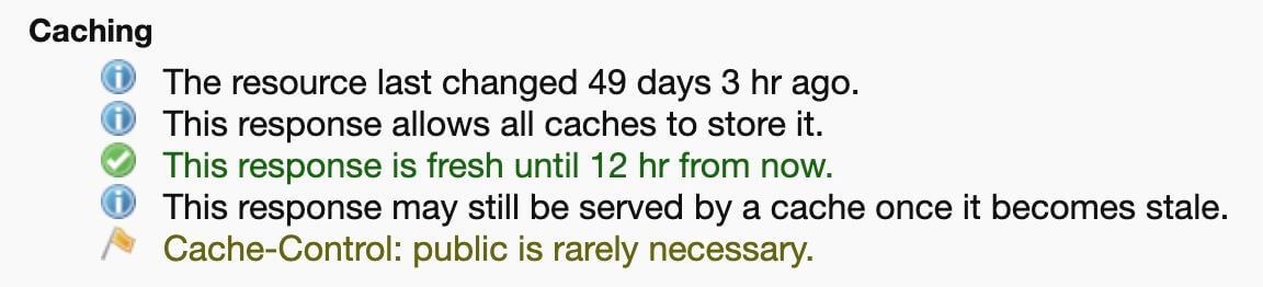 キャッシュも非常に複雑なトピックです。キャッシュエントリを検証するだけでなく、新鮮さを伝えることができるHTTPレスポンスヘッダーは多数あります。Cache-Controlディレクティブは、非常に多くの柔軟性と制御を提供します。ただし、開発者は、それがもたらす間違いの追加の機会に注意する必要があります。キャッシュ可能なリソースが適切にキャッシュされていることを確認するためにサイトを定期的に監査することをお勧めします。LighthouseREDbotなどのツールは、分析の簡素化に役立ちます。