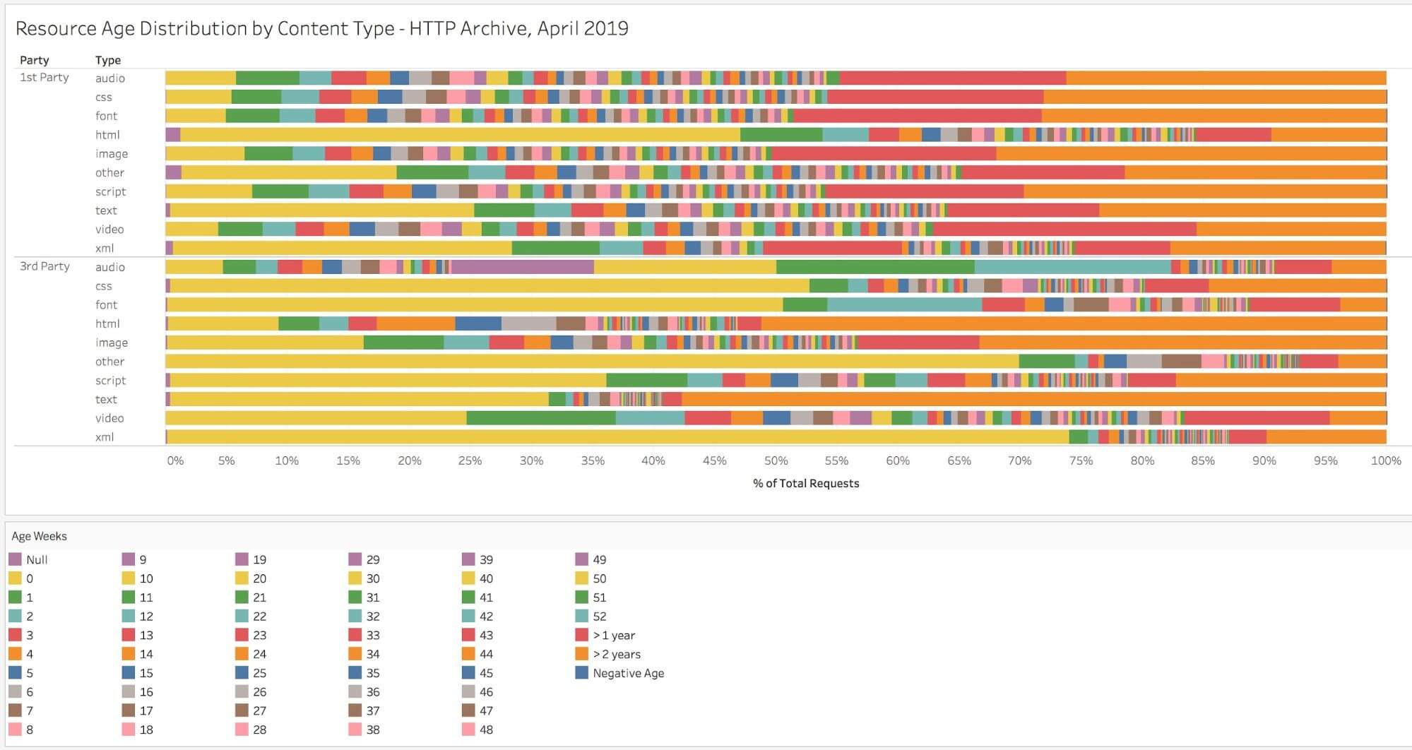 これをファーストパーティとサードパーティで分けると、ファーストパーティのリソースの70%がより長いTTLの恩恵を受けることもわかります。これは、キャッシュ可能なものに特に注意を払い、キャッシュが正しく構成されていることを確認する必要があることを明確に強調しています。
