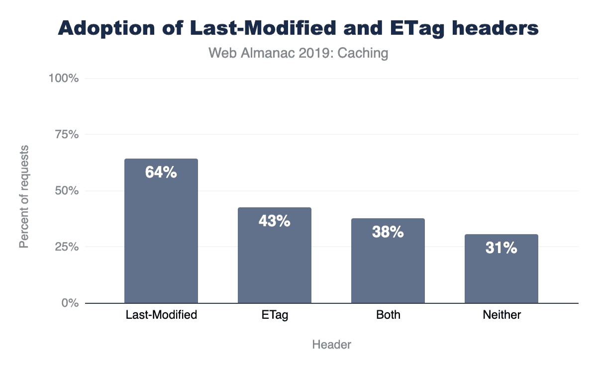 全体としてレスポンスの65%はLast-Modifiedヘッダーで、42%はETagで提供され、38%は両方を使用します。ただし、レスポンスの30%にはLast-Modifiedヘッダー、ETagヘッダーは含まれていません。