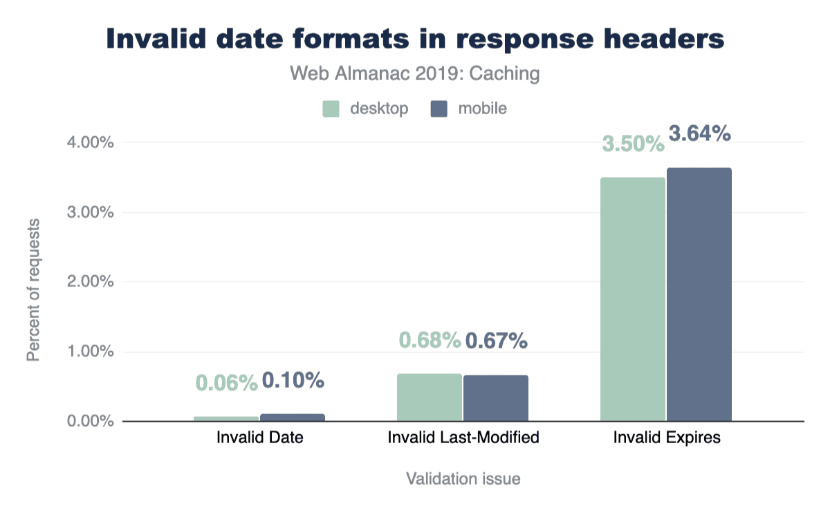 通常、Date HTTPレスポンスヘッダーは、クライアントにレスポンスを提供するWebサーバーまたはCDNによって生成されます。ヘッダーは通常、サーバーによって自動的に生成されるため、エラーが発生しにくい傾向はあります。これは、無効なDateヘッダーの割合が非常に低いことを反映しています。 Last-Modifiedヘッダーは非常に類似しており、無効なヘッダーは0.67%のみでした。しかし、驚いたのは、3.64%のExpiresヘッダーが無効な日付形式を使用していたことです!