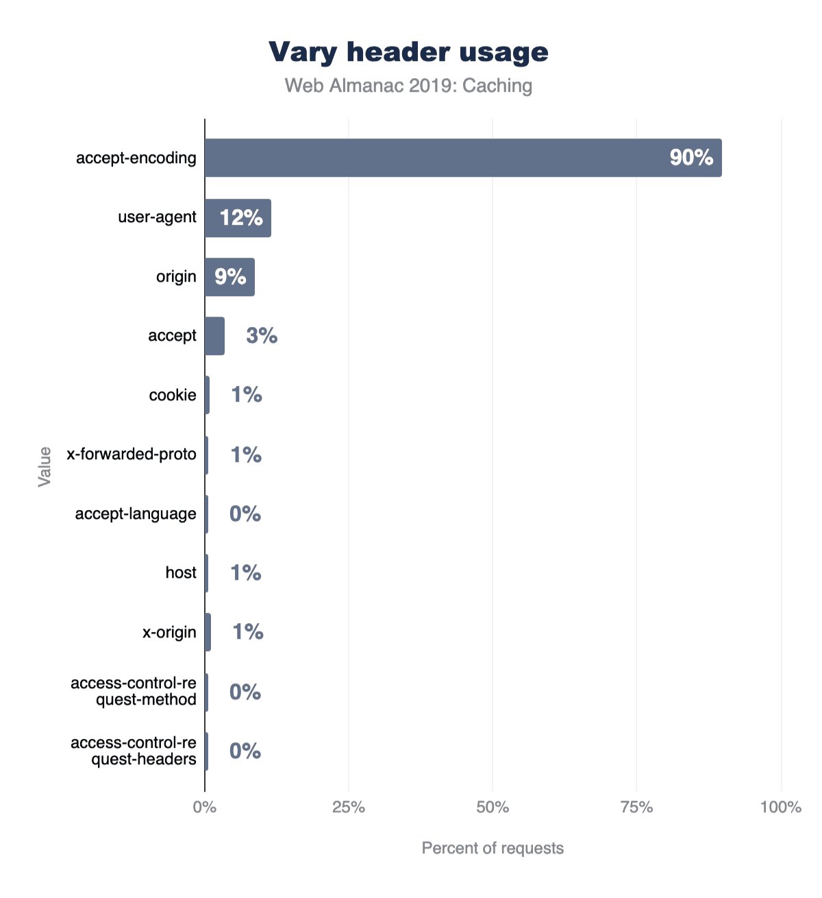 以下のグラフは、上位10個のVaryヘッダー値の人気を示しています。 Accept-EncodingはVaryの使用の90%を占め、User-Agent(11%)、Origin(9%)、Accept(3%)が残りの大部分を占めています。
