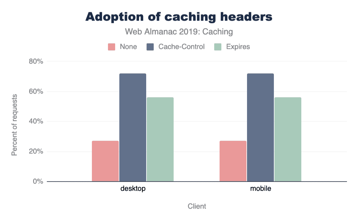 レスポンスの72%はCache-Controlヘッダーで提供され、レスポンスの56%はExpiresヘッダーで提供されます。ただし、レスポンスの27%はどちらのヘッダーも使用していないため、ヒューリスティックキャッシュの対象となります。これは、デスクトップとモバイルサイトの両方で一貫しています。