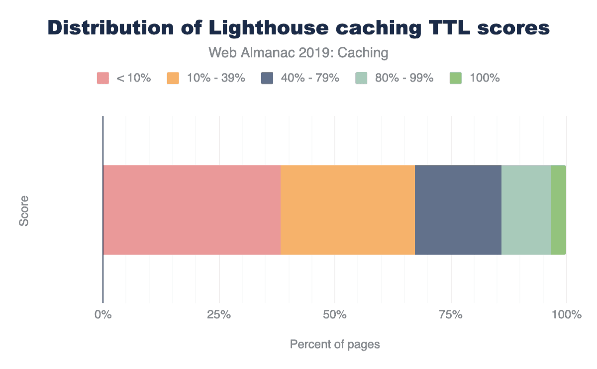 100%を獲得したサイトは3.4%のみです。これは、ほとんどのサイトがキャッシュの最適化の恩恵を受けることができることを意味します。サイトの圧倒的多数が40%未満で、38%が10%未満のスコアを記録しています。これに基づいて、Webにはかなりの量のキャッシュの機会があります。