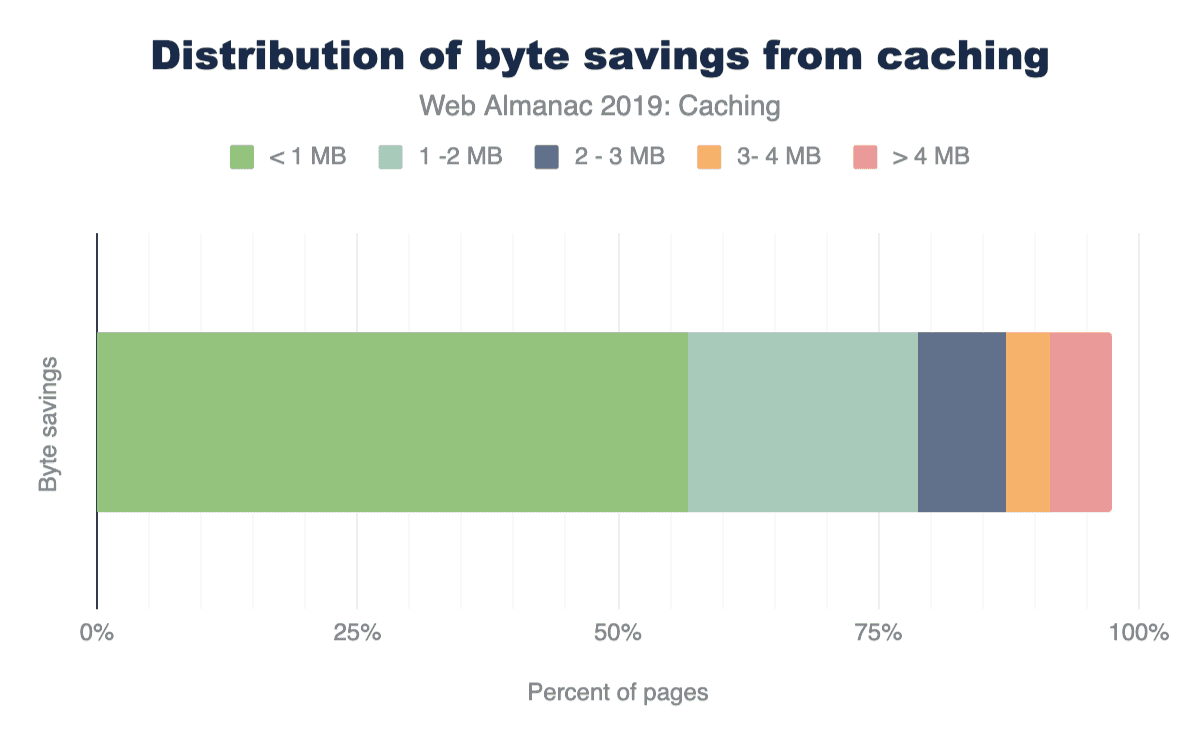 Lighthouseは、より長いキャッシュポリシーを有効にすることで、繰り返しビューで保存できるバイト数も示します。追加のキャッシュの恩恵を受ける可能性のあるサイトのうち、82%がページの重みを最大で1MB削減できます。