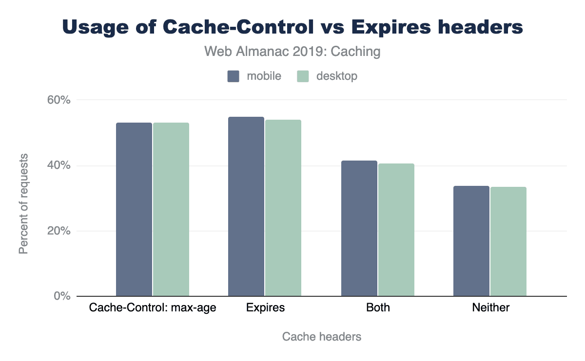 HTTPレスポンスの53%は、max-ageディレクティブを持つCache-Controlヘッダーが含まれ、54%はExpiresヘッダーが含まれます。ただし、これらのレスポンスの41%のみが両方のヘッダーを使用します。つまり、レスポンスの13%が古いExpiresヘッダーのみに基づいてキャッシュされます。