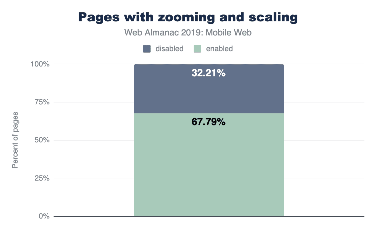 しかし開発者はこれを悪用しすぎて、3つのサイトのほぼ1つ(32.21%)がこの機能を無効にしており、Appleは(iOS 10の時点で)ウェブ開発者がズームを無効にすることを許さなくなっています。モバイルSafariは単にタグを無視する。世界中のウェブトラフィックの11%以上を占める新しいアップルのデバイスでは、どんなサイトでもズームや拡大縮小が可能です。