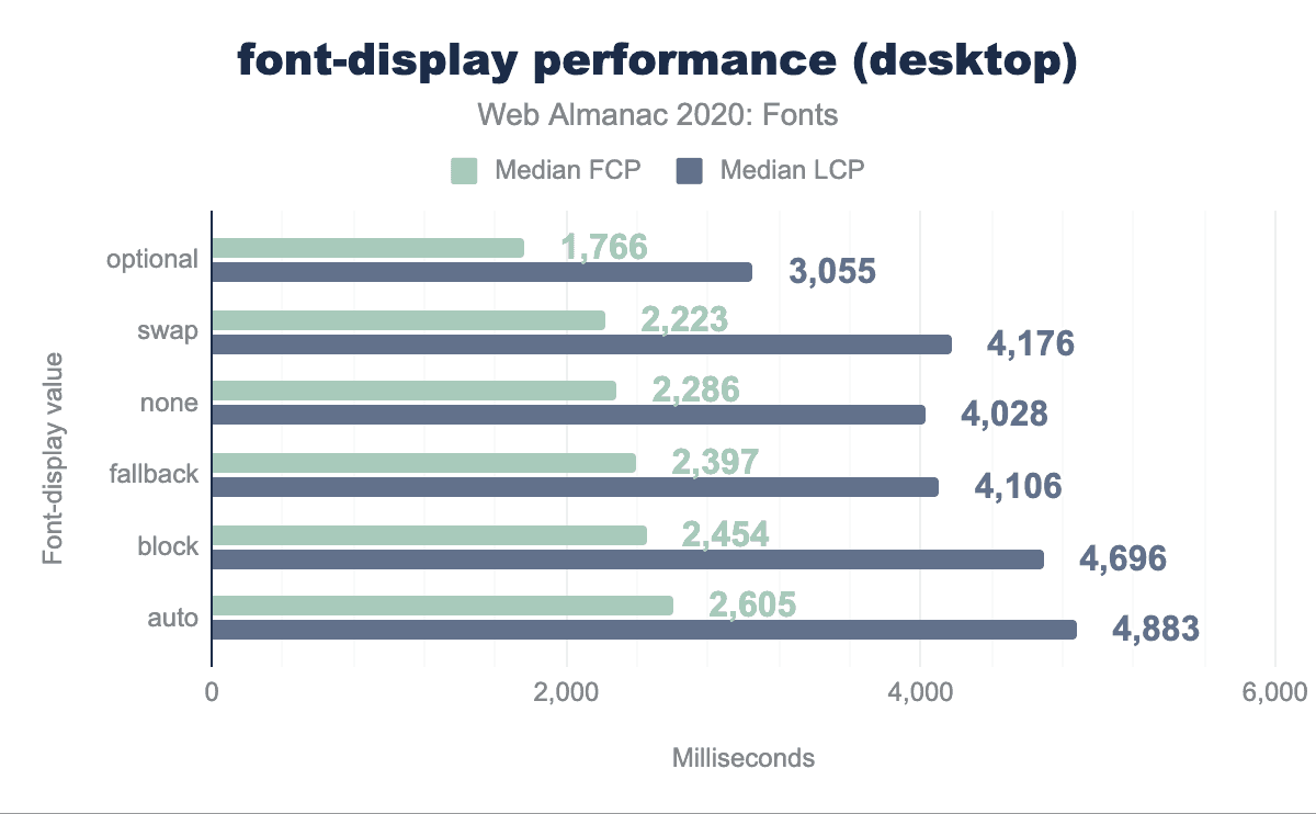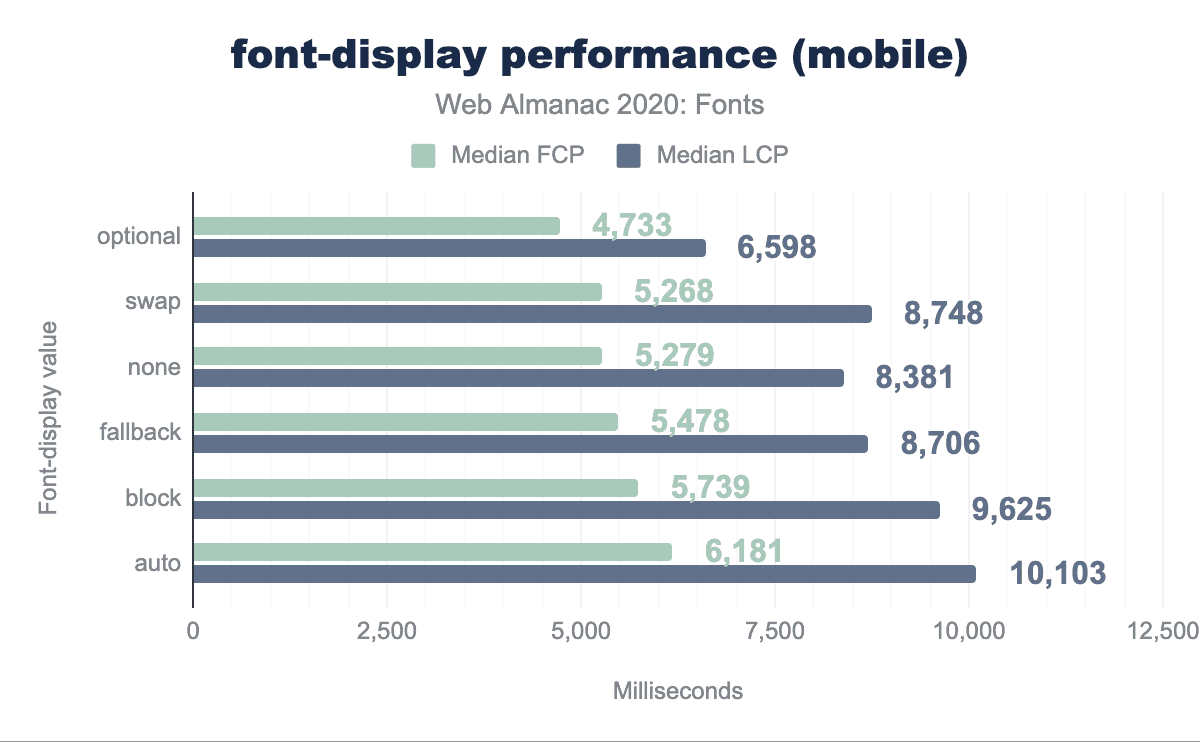これらの設定がコンテンツの初回ペイントと最大のコンテンツフルペイントに与える影響を分析できます。驚くことではありませんが、optionalの設定は最大のコンテンツフルペイントに大きな影響を与えます。また、コンテンツの初回ペイントにも影響がありますが、これは因果関係よりも相関関係の方が強いかもしれません。というのも、blockを除くすべてのモードは、”極端に小さいブロック期間”の後に 何らかの テキストを表示するからです。