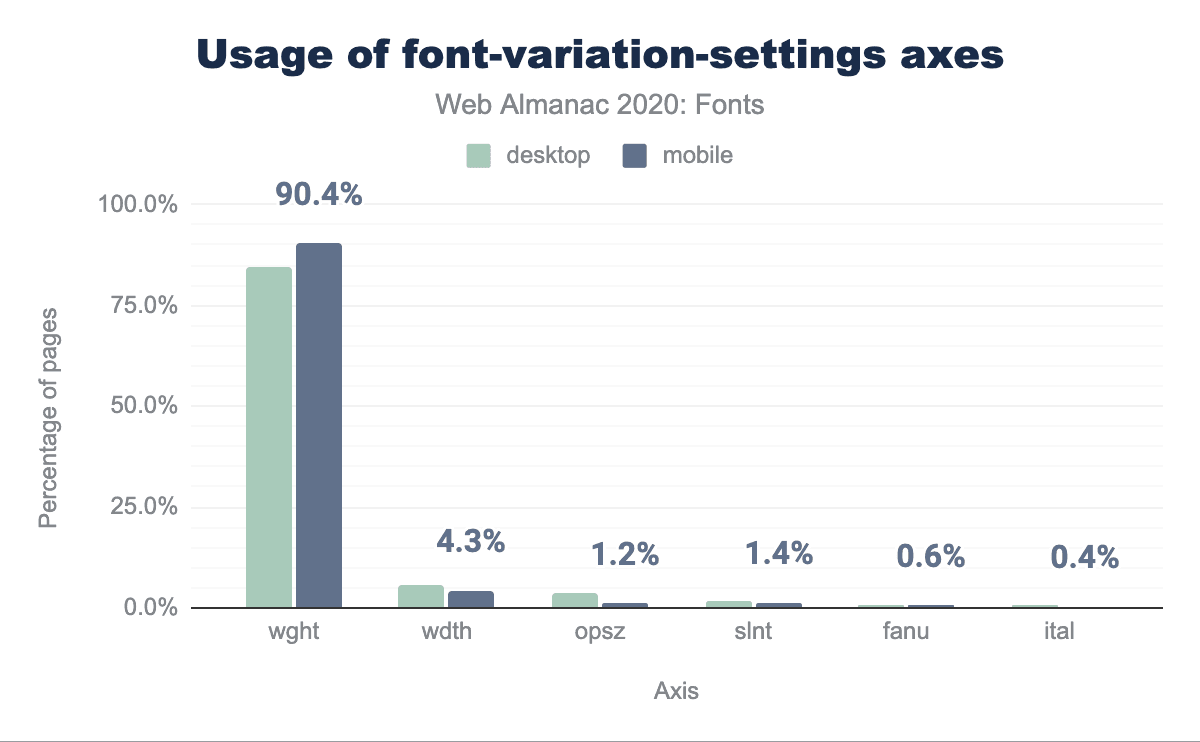 もっともよく使われている軸はwght(重さを制御する)で、デスクトップで84.7%、モバイルでは90.4%となっています。しかし、wdth(幅)は可変フォントの使用率の約5%を占めている。2020年、Google Fontsは幅軸と重さ軸の両方を持つ2軸フォントの提供を開始した。