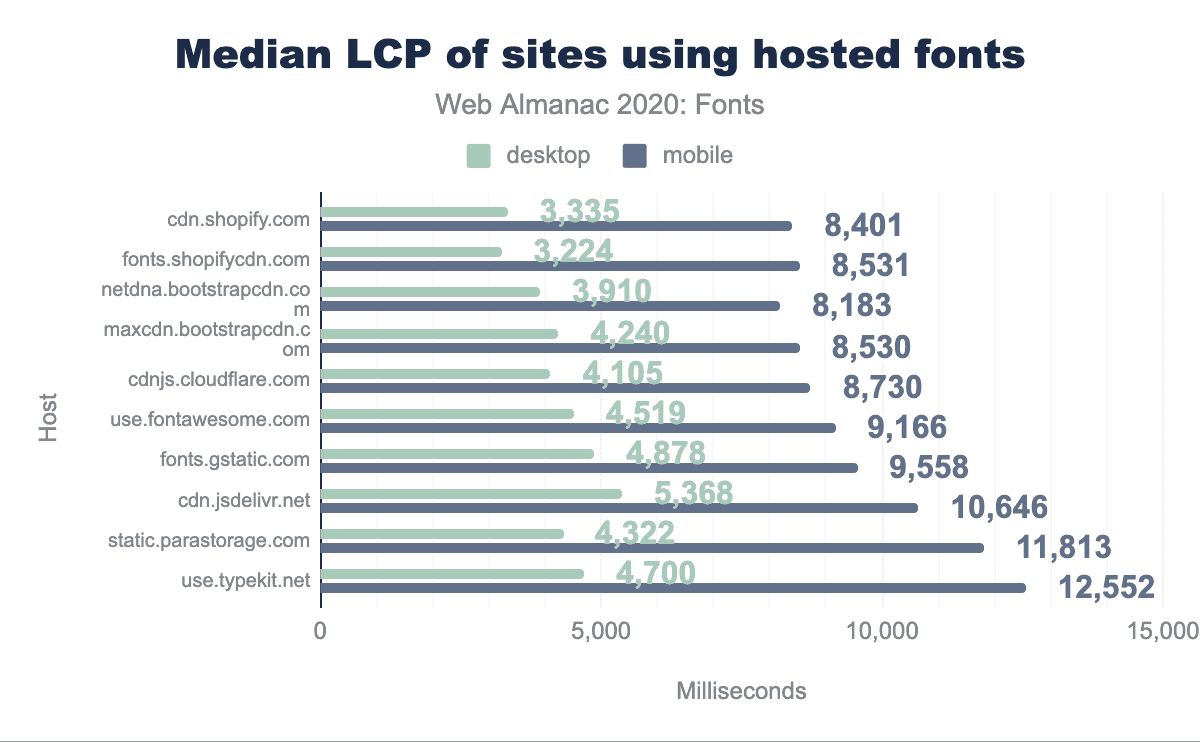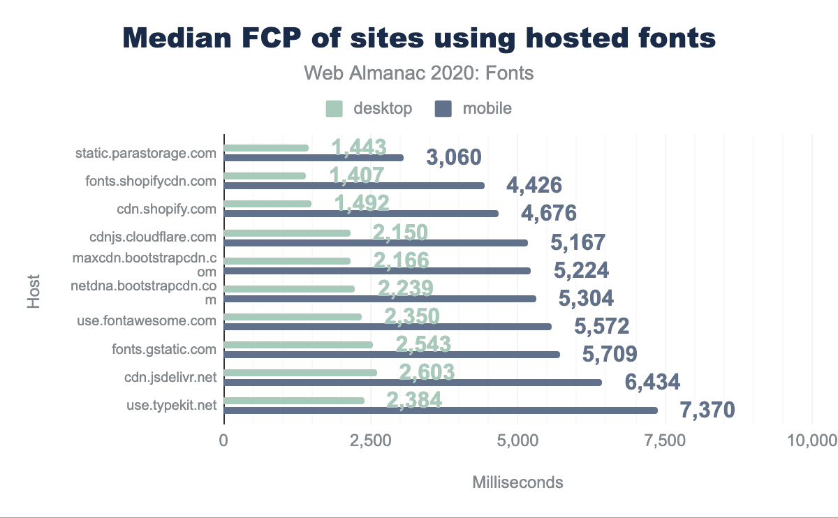 Adobe(use.typekit.net)やMonotype(fast.fonts.com)などの商用サービスを見ていると、デスクトップではGoogle Fontsと同じかわずかに速い傾向があるが、モバイルでは明らかに遅いという点が興味深いです。これまでの常識では、これらのサービスで使用されているトラッキングスクリプトが大幅に速度を低下させていると考えられていましたが、現在では以前ほど問題になっていないようです。私たちが測定しているのはサイトのパフォーマンスであり、必ずしもフォントホストのパフォーマンスではないことは事実ですが、これらのトラッキングスクリプトはクライアントでのフォント読み込みに影響を与えるため、これらの見解を含めることは適切だと思われます。