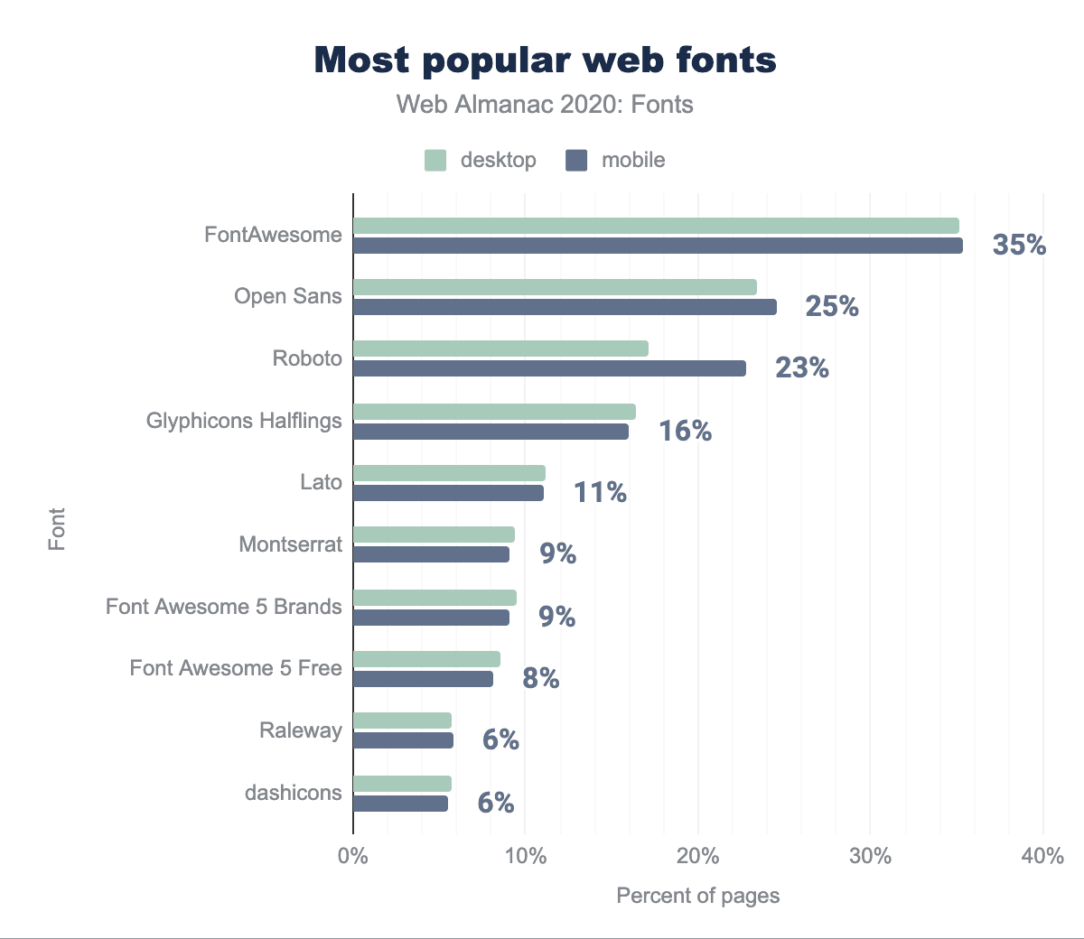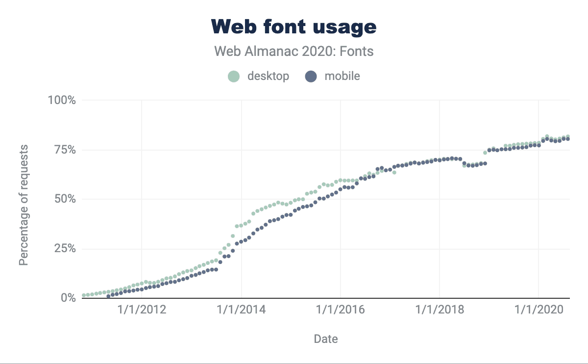 ウェブフォントの使用率は、時間の経過とともに着実に増加しており(2011年末にはゼロに近かった)、デスクトップ向けのウェブページでは82%、モバイルでは80%がウェブフォントを使用しています。