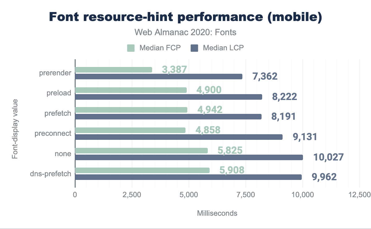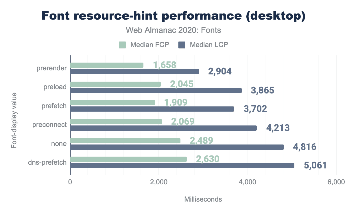 このデータを分析すると、dns-prefetch設定は、もっとも一般的な設定であるにもかかわらず、あまりパフォーマンスを改善していないことがわかります。おそらく、人気のあるWebフォントサーバのDNSは、いずれにせよキャッシュされていると思われます。他の設定では、使いやすさ、柔軟性、パフォーマンスの向上の点で、preconnectがもっとも優れています。2020年3月現在、Google Fontsは、HTMLソースのCSSリンクの直前にこの行を追加することを推奨している。