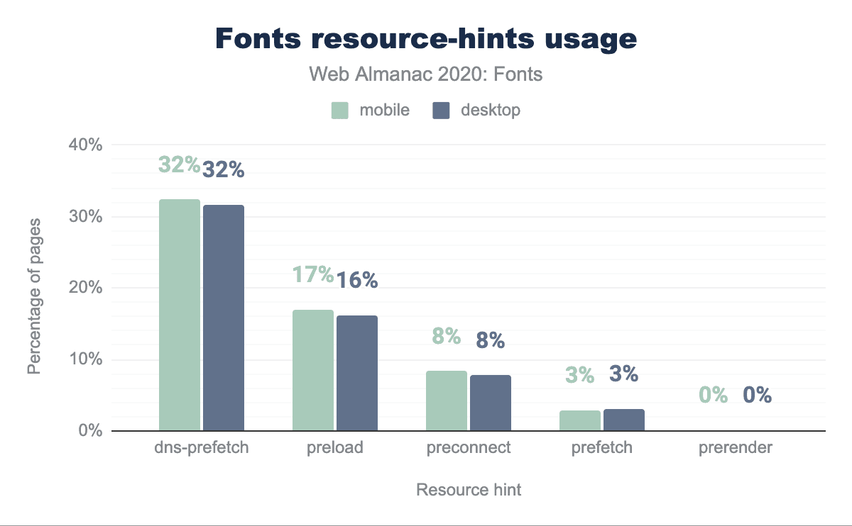 HTMLにリソースヒント要素を追加すると、2つ目の接続が早く始まります。さまざまなリソースヒントの設定は、実際のフォントリソースのURLを取得するまでの距離を制御します。もっとも一般的なのは(ウェブページの約32%)dns-prefetchですが、ほとんどの場合、より良い選択肢があります。
