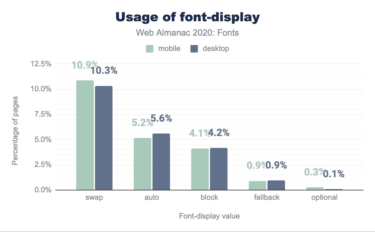 font-displayの設定は、Webフォントの読み込みを待つ間の動作を制御し、一般的にはパフォーマンスと視覚的な豊かさのトレードオフとなります。 もっともポピュラーなのはswapで、約10%のWebページで使用されています。これは、Webフォントがすぐ読み込まれない場合に予備フォントを使用して表示し、読み込まれたときにWebフォントを入れ替えるというものです。その他の設定としては、テキストの表示を一切行わない(Flash効果の可能性を最小限に抑える)blockswapと似ていますが、適度な時間でフォントが読み込まれない場合に使用するfallback、すぐに諦めて予備フォントを使用するoptionalなどがあります。これを使用しているのは、パフォーマンスを重視するウェブページの1%に過ぎません。