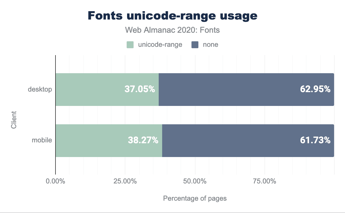 テキストレイアウトがUnicodeをグリフにマッピングする方法には多くの複雑さがあるため、unicode-rangeを正しく適用するのは難しいが、Google Fontsはこれを自動的かつ透過的に行う。しかし、Google Fontsはこれを自動的かつ透過的に行う。いずれにせよ、現在の使用率はデスクトップで37%、モバイルで38%となっている。