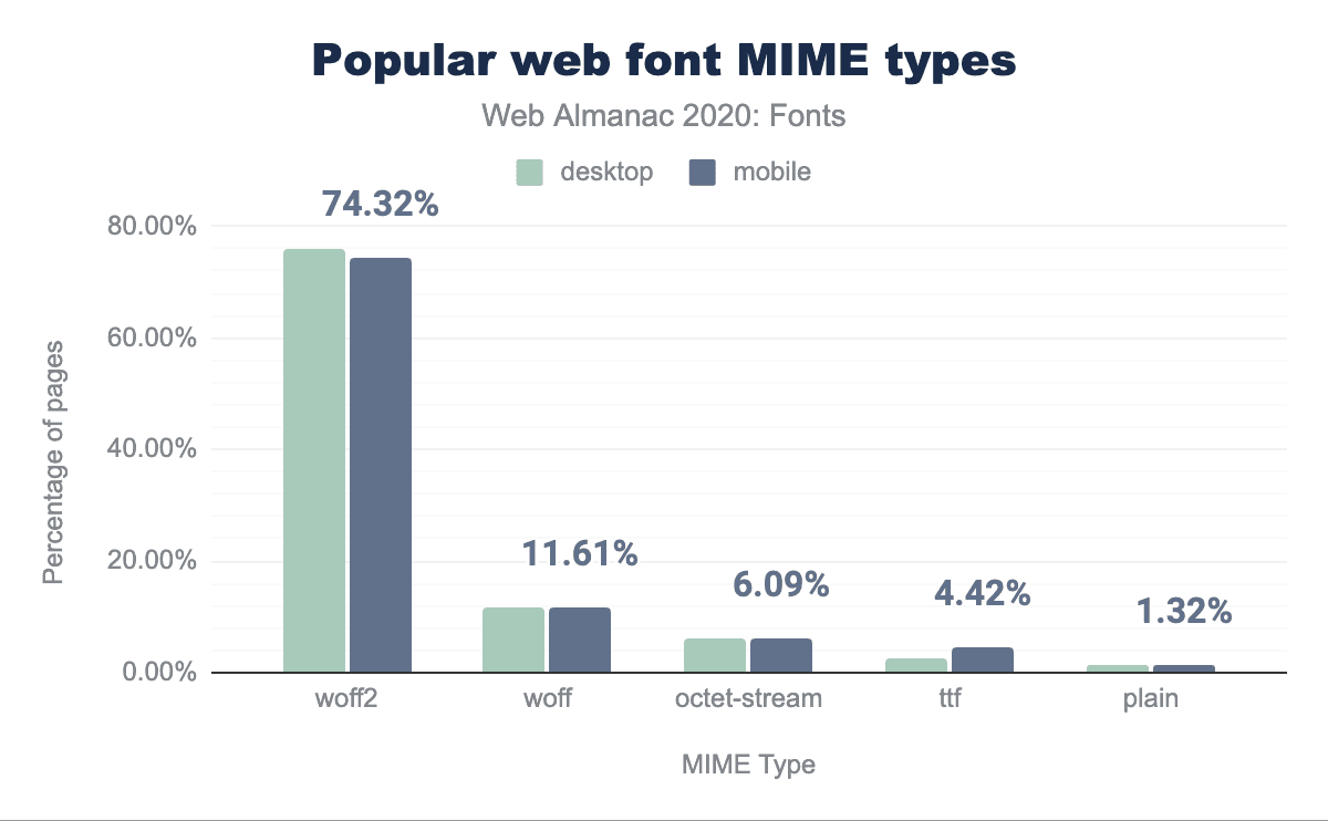 OTFやTTFファイルなどの非圧縮フォントは圧縮フォントに比べて2〜3倍の大きさですが、それでも提供されるフォントの約5%を占めておりモバイルでの利用が、多いことが分かります。もしこれらのフォントを提供しているのであれば、最適化が可能であることを示すレッドフラッグとなるはずです。