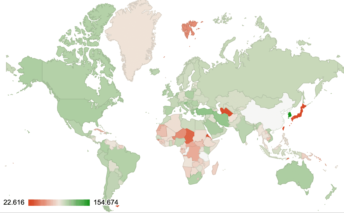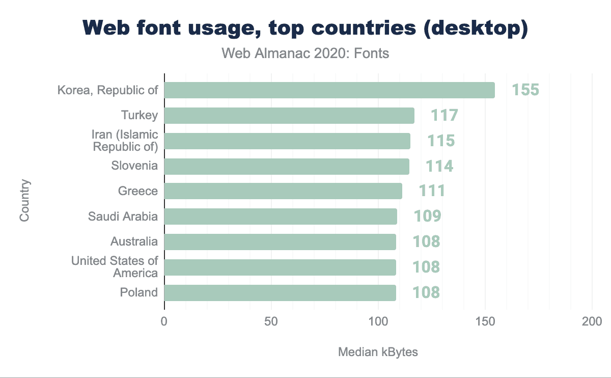 ウェブフォントの使用率は、少数の例外を除き、世界中でほぼ一貫しています。以下のグラフはウェブページあたりのウェブフォントのキロバイト数の中央値に基づいておりこれはフォントの多さ、大きさ、またはその両方を示す指標となります。