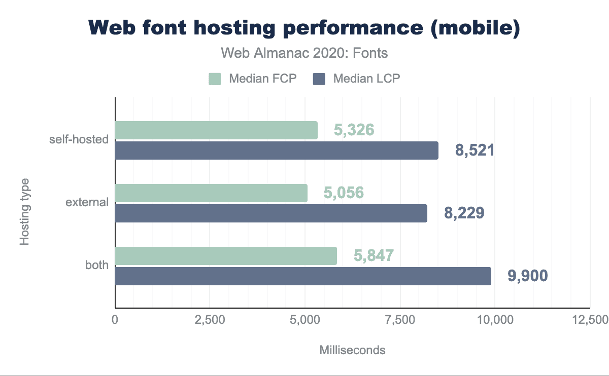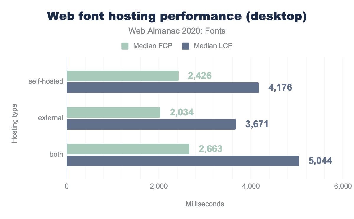 上記のデータからホスティング戦略との因果関係を推測するのは健全でないでしょう、なぜなら関係を混同する他の変数があるからです。しかし、それはさておきセルフホスティングフォントを追加しても、必ずしもパフォーマンスが向上するとは限らないことがわかりました。ホスティングされたフォントソリューションは、多くの最適化(サブセット化、OpenType機能の削除、可能な限り小さいフォントフォーマットの確保など)を実行しますが、セルフホスティングの場合は必ずしも再現されないことがあります。