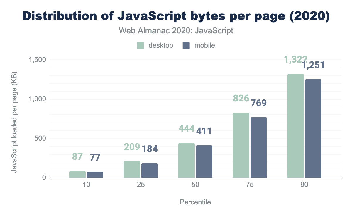 中央値のサイト(50パーセンタイル)では、デスクトップ端末で読み込んだときに444KBのJavaScriptを送信し、モバイル端末ではわずかに少ない(411KBの)JavaScriptを送信しています。