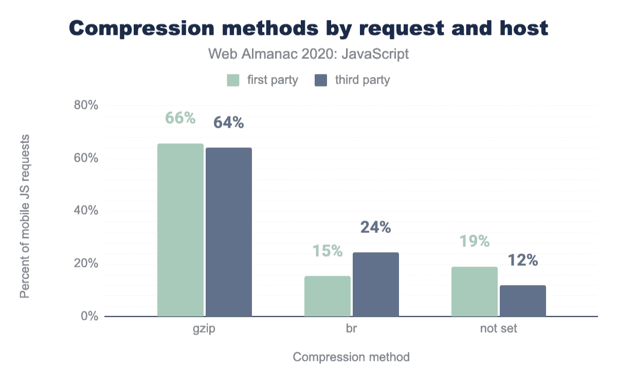 サードパーティ製のスクリプトは、圧縮を全く行わずに提供される可能性も低くなっています。サードパーティ製のスクリプトの12%がGzipもBrotliも適用されていないのに対し、ファーストパーティ製のスクリプトは19%です。