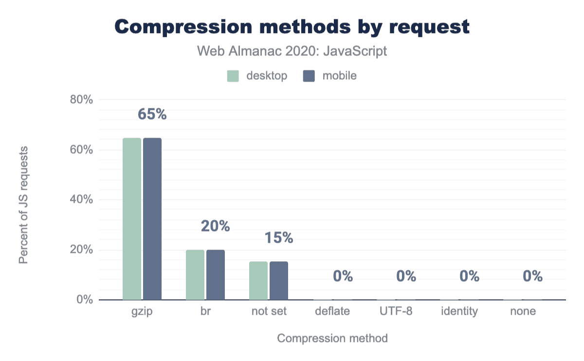 すべてのJavaScriptリクエストの85%には、何らかのレベルのネットワーク圧縮が適用されています。Gzipがその大部分を占めており、スクリプトの65%にGzip圧縮が適用されているのに対し、Brotli(br)は20%です。Brotli(Gzipよりも効果が高い)の割合は、ブラウザのサポートに比べれば低いですが、正しい方向に向かっており、昨年より5%もポイント増加しています。