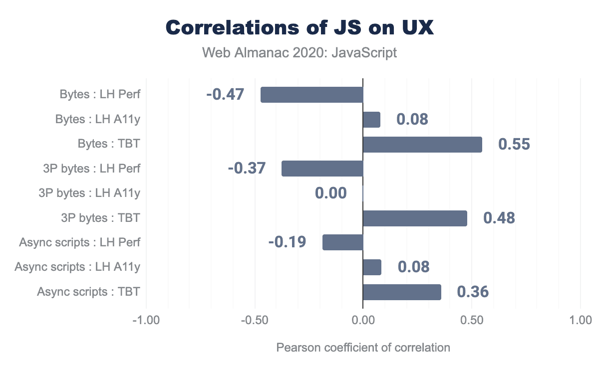 総ブロッキング時間とJavaScriptのバイト数の関係はさらに重要です (全体のバイト数では0.55、サードパーティのバイト数では0.48)。これは、ブラウザがページ内でJavaScriptを実行させるためにブラウザが行わなければならないすべての作業について知っていることを考えれば、それほど驚くべきことではありません。