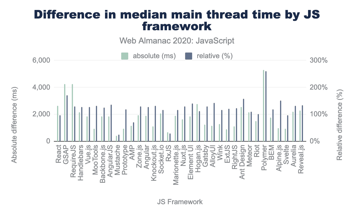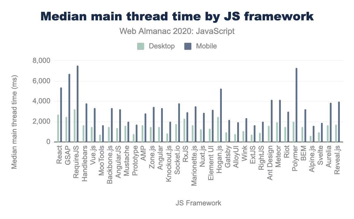ReactやGSAP、RequireJSなどのツールは、デスクトップやモバイルのページビューに関わらず、ブラウザのメインスレッドに多くの時間を費やす傾向があります。アルパインやスベルテのようなツールは、全体的にコードが少なくなる傾向はありますが、同じツールでもメインスレッドへの影響が少なくなる傾向はあります。