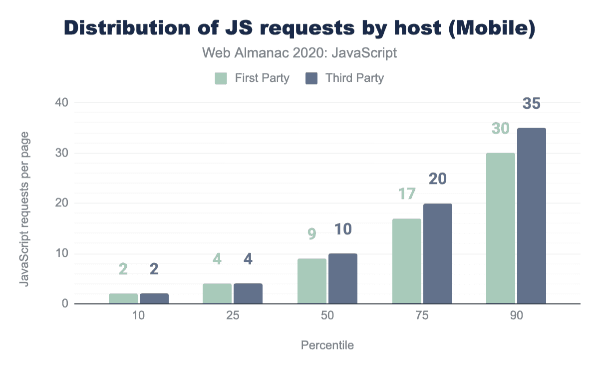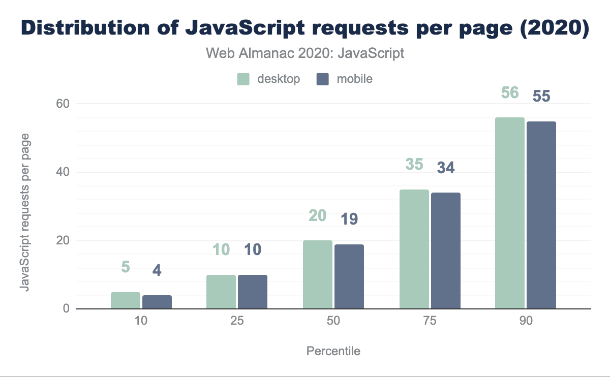 中央値では、ページは20回のJavaScriptリクエストを行います。これは中央値で19回のJavaScriptリクエストを行っていた昨年よりもわずかに増加しています。