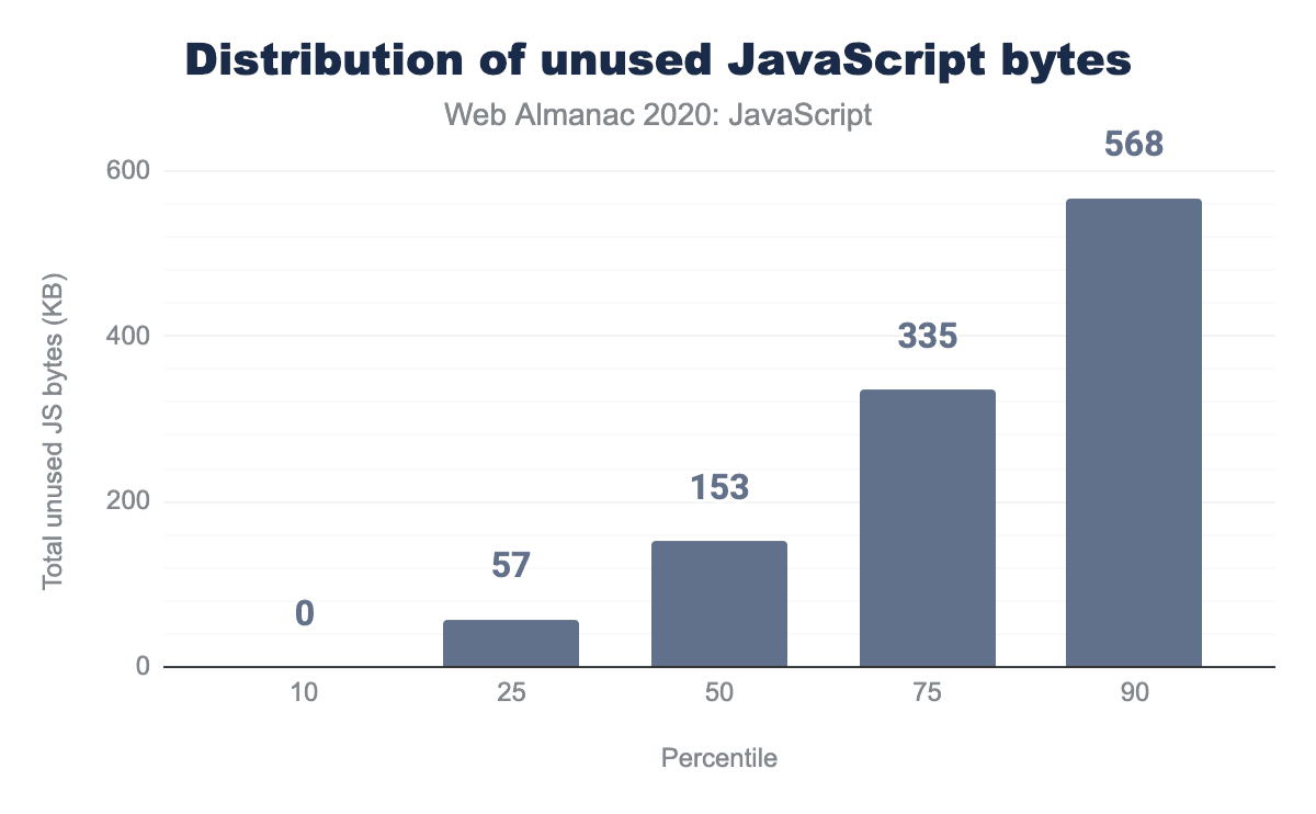 少なくともこの重量の一部は不要なもののようです。任意のページロードでどのくらいのJavaScriptが未使用になっているかの内訳を見ると、中央値のページでは152KBの未使用JavaScriptが提供されていることがわかります。その数は75パーセンタイルで334KB、90パーセンタイルで567KBに跳ね上がっています。