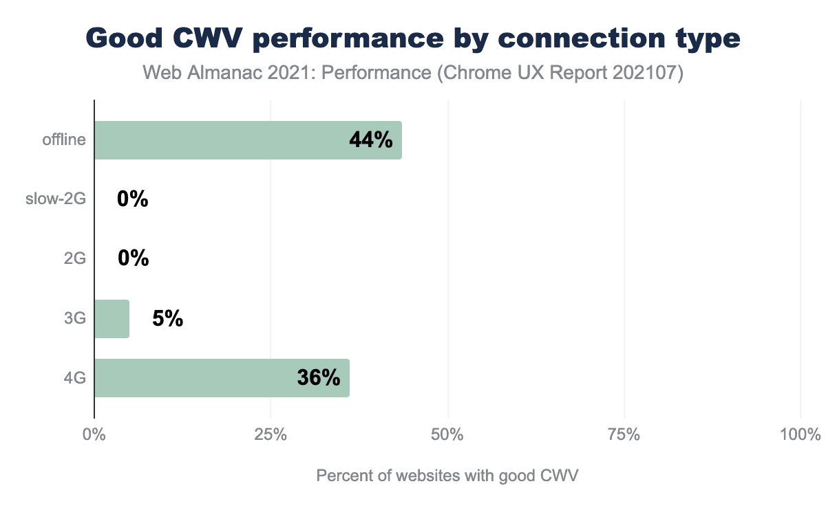 CrUXの接続タイプ別データはわかりにくいかもしれません。トラフィックに基づくものではありません。ある接続タイプでWebサイトに何らかの経験があれば、その接続タイプの分母が増加します。もし、その接続タイプでそのウェブサイトにとって良い経験があれば、それは分子を増加させます。別の言い方をすれば、4Gの速度でページロードを経験したすべてのWebサイトのうち、36%はCWVが良好であったということです。