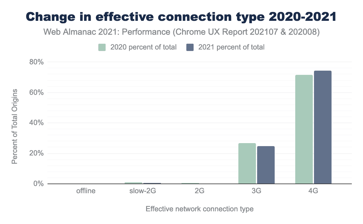 先ほど、LCPとFIDの改善について、前年比で改善したと申し上げました。これらは、モバイル機器やモバイルネットワークの高速化が一因と思われます。上図では、3Gでの総アクセス元が2パーセントポイント減少し、4Gでのアクセス元が3パーセントポイント増加しています。オリジンの割合は、必ずしもトラフィックと相関があるわけではありません。しかし、人々がより高速な接続を利用できるようになれば、その接続タイプからアクセスされるオリジンもより多くなると推測されます。
