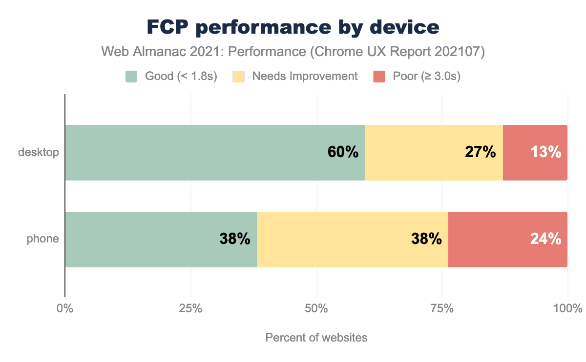 例年通り、モバイル端末よりもデスクトップマシンの方が、パフォーマンスが高いという結果になりました。このため、実際のモバイル端末でサイトのパフォーマンスをテストし、実際のユーザー指標(つまり、フィールドデータ)を測定することが非常に重要です。開発者向けツールでモバイルをエミュレートすることは、研究室(=開発)では便利ですが、実際のユーザー体験を代表するものではありません。