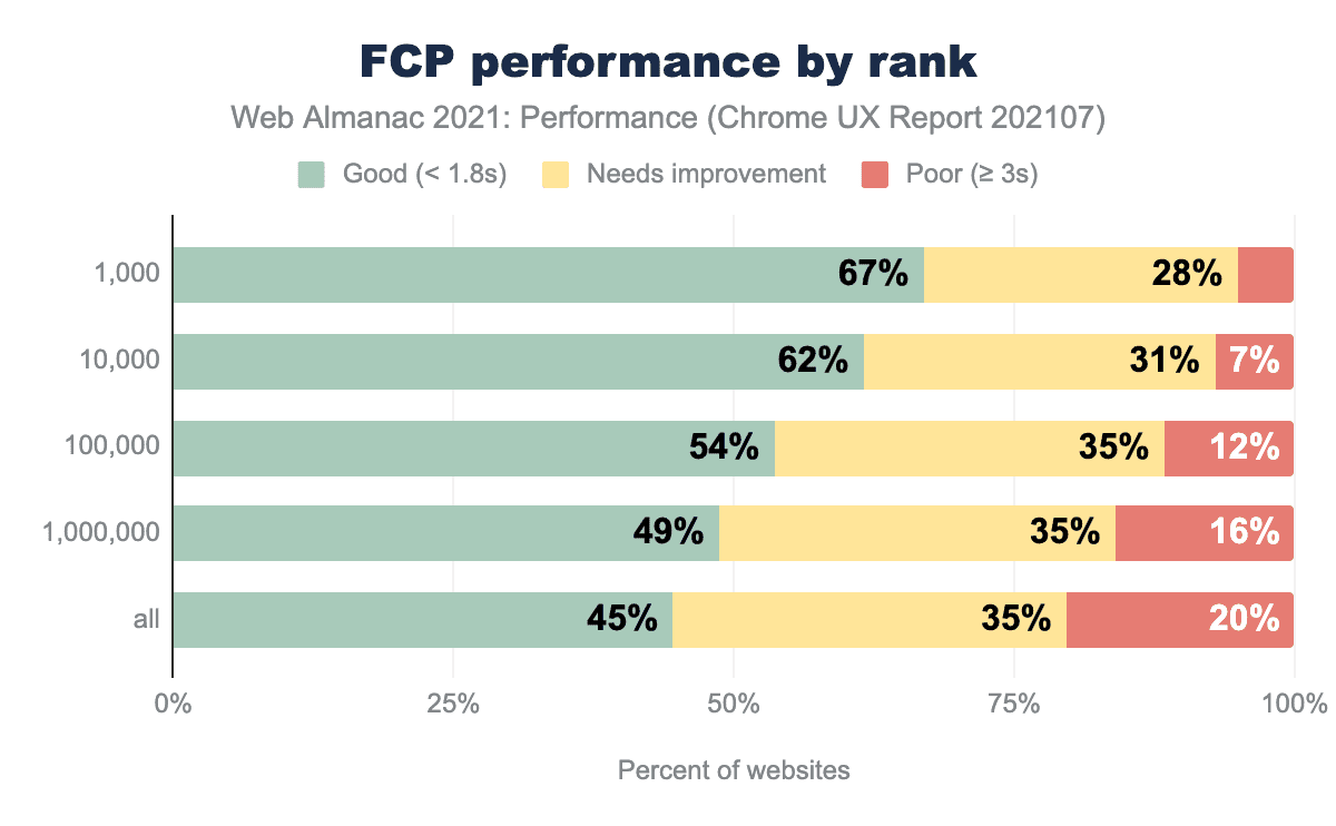 Core Web Vitalsでは、上位1,000サイトが他を大きく引き離している。グラフの真ん中には、CLSに起因するパフォーマンスの低下という興味深い谷が発生しています。FIDはすべてのグループ化で横ばいでした。他のすべての指標は、上位のランキングほど高いパフォーマンスを示すという相関関係にあります。