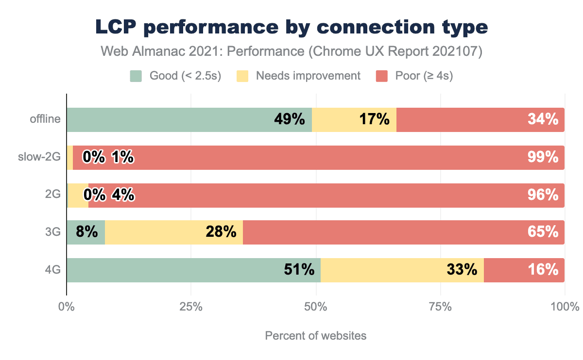 LCPが良好なオフラインの起点は、4Gの体験とより密接に一致していますが、LCPが悪い体験はオフラインの方が高いのです。LCPはFCPの後に発生し、0.7秒の追加予算があるため、FCPよりもオフラインのウェブサイトの方が良いLCPを達成した可能性があります。