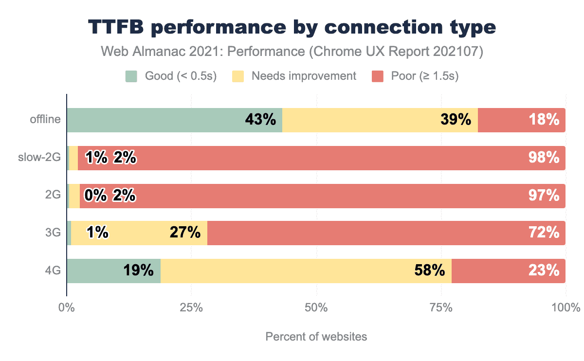 オフライン接続でどうしてTTFBが発生するのか、疑問に思われるかもしれません。おそらく、TTFBデータを記録し送信するオフラインのサイトのほとんどは、サービスワーカーキャッシングを使用していると思われます。TTFBは、そのレスポンスがCache Storage APIやHTTP Cacheからのものであっても、ページのレスポンスの最初の1バイトを受信するまでの時間を測定します。実際のサーバーが関与している必要はない。レスポンスにサービスワーカーからのアクションが必要な場合、サービスワーカー・スレッドの起動とレスポンスの処理にかかる時間も、TTFBの一因になり得ます。しかし、サービスワーカーの起動時間を考慮しても、これらのサイトは平均して、他の接続カテゴリよりも速く最初のバイトを受信します。