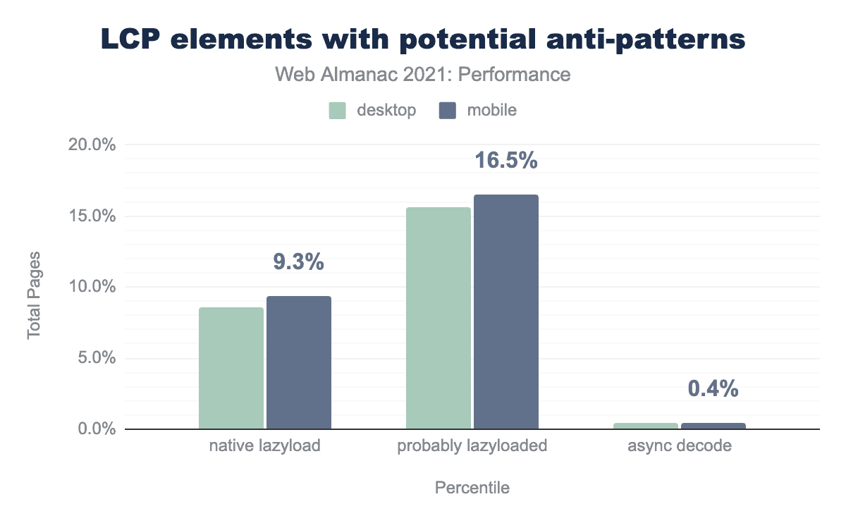 ユーザー体験の観点から、LCPの要素はできるだけ速くロードされることが望まれます。LCPがCore Web Vitalの1つに選ばれた理由は、ユーザー体験です。レンダリングがさらに遅くなるため、遅延ロードさせないようにします。しかし、9.3%のページがLCPの <img> 要素にネイティブのloading=lazyフラグを使用していることがわかります。