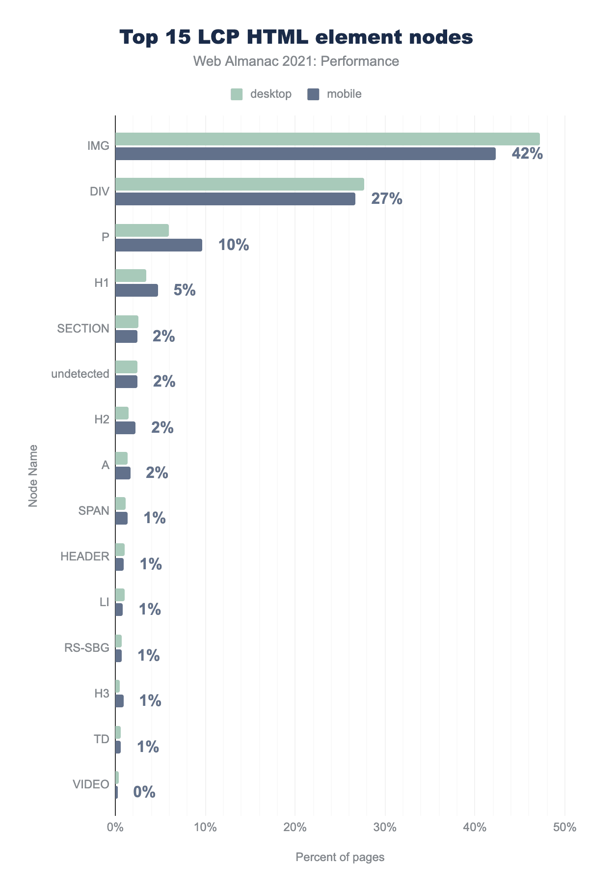 HTMLノードに関係なく、71-79%のページでLCP要素が、画像であったことがわかります。さらに、デスクトップ端末ではLCPが、画像である割合が高くなっています。これは、画面サイズが小さいため、画像がビューポートからはみ出し、見出しテキストがもっとも大きな要素になることが、原因である可能性があります。