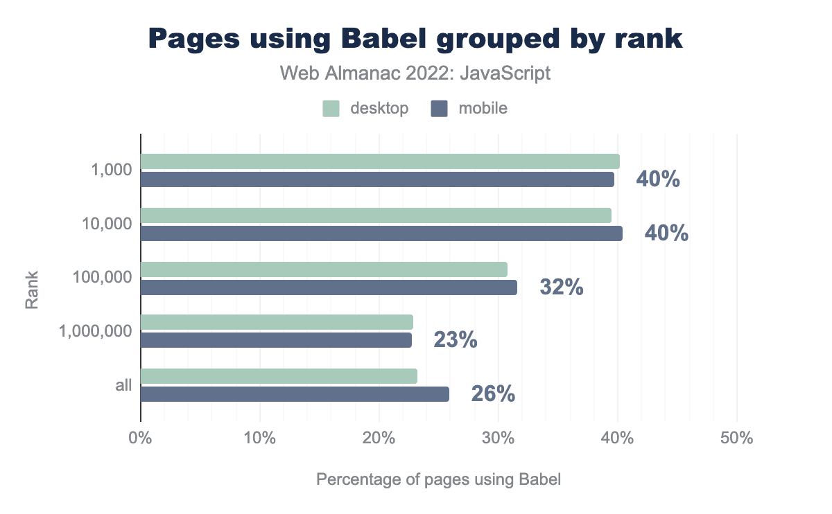 トランスパイラとは、新しいJavaScriptの機能を古いブラウザで実行できる構文に変換するため、ビルド時にツールチェーンでよく使われるものです。JavaScriptは長年にわたって急速に進化してきたため、これらのツールは今でも使用されています。今年のWeb Almanacでは、広く互換性のあるプロダクション対応のJavaScriptを提供する際の Babel の使用に関する分析が新たに掲載されました。とくにBabelに注目したのは、開発者コミュニティで代替品よりも広く使われているためです。