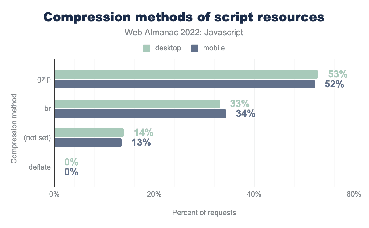 JavaScriptの状況は、昨年のトレンドが示唆するように、ほぼ継続しています。確かに提供数は増えていますが、minifiation、リソースヒント、圧縮、さらには使用するライブラリに至るまで、さまざまなテクニックを利用することで過剰なJavaScriptの悪影響を軽減しようとしています。