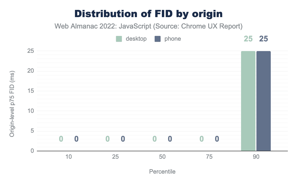 このグラフは、全ウェブサイトの75パーセンタイルFID値の分布を表しています。中央のウェブサイトは、デスクトップとモバイルの両方のユーザー体験の少なくとも75%において、FID値が0msです。この「完璧なFID」体験は、75パーセンタイルのWebサイトにまで及んでいます。90パーセンタイルになると、不完全なFID値が見られるようになりますが、これは25ミリ秒にすぎません。