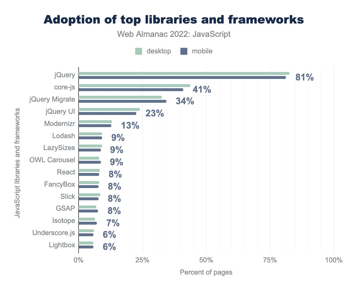 jQuery、UIフレームワーク、マイグレーションプラグインの組み合わせが上位7位を占め、core-jsもライブラリの利用状況において重要な役割を果たしていることから、jQueryが大きな力を秘めていることは明らかです。