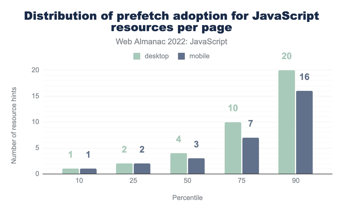 ここでの prefetch の採用はやや意外で、1ページあたりJavaScriptリソースに対して3つの prefetch ヒントを出しています。しかし、75パーセンタイルと90パーセンタイルにあるこれらのヒントの数は、発生しないページ移動のための未使用リソースという形で、かなりの量のムダがあることを示唆しています。