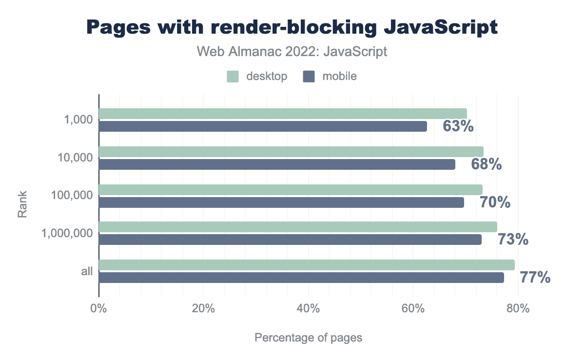 モバイルページの77%が <head> 内にレンダリングをブロックするスクリプトを少なくとも1つ含んでいるのに対し、デスクトップページの79%はこのようなスクリプトを含んでいることがわかりました。スクリプトがレンダリングをブロックすると、ページコンテンツが迅速に描画されなくなるため、これは懸念すべき傾向です。