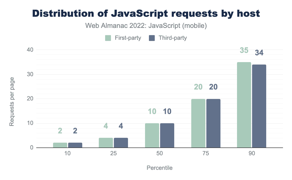 2022年、モバイルページの中央値は21のJavaScriptリクエストに応答したのに対し、90パーセンタイルでは60のリクエストに応答しています。昨年と比較すると、中央値で1リクエスト、90パーセンタイルで4リクエストの増加です。