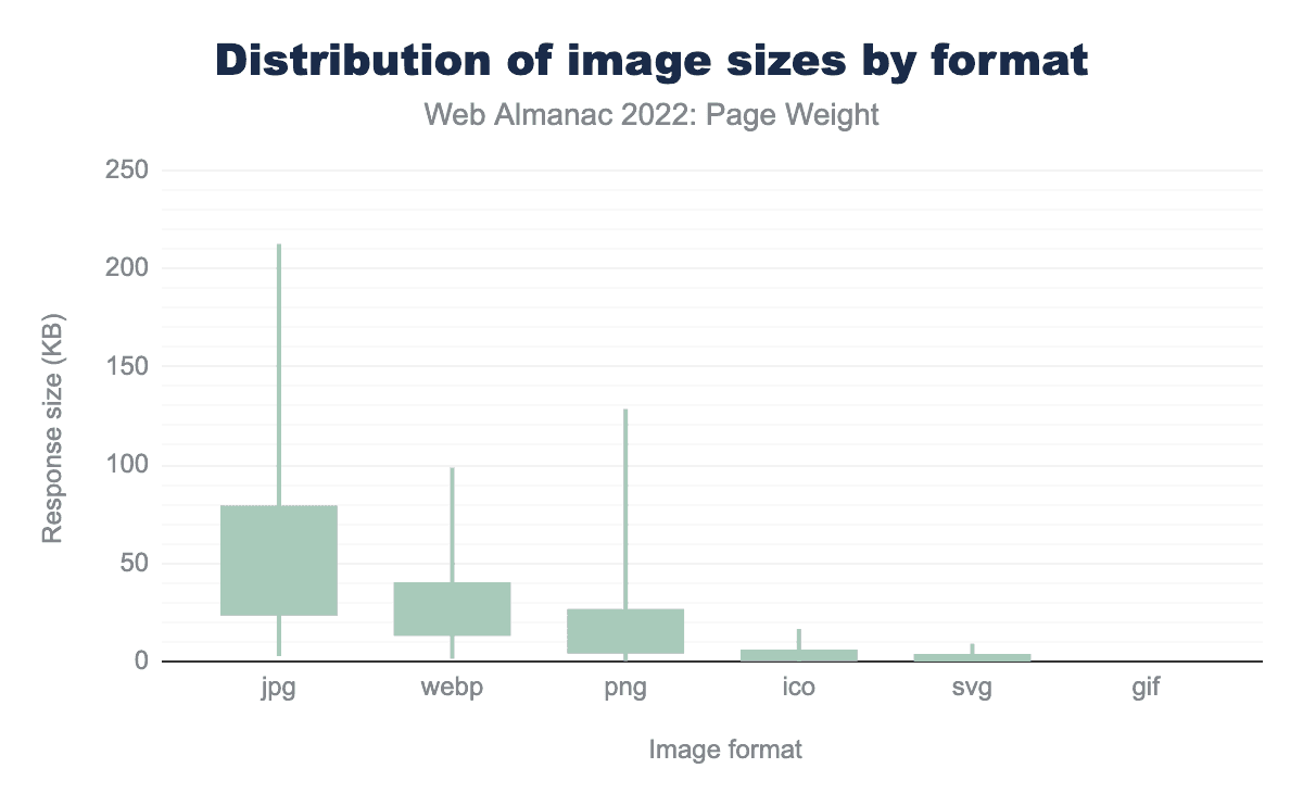 Web Almanacの開始以来、画像はページ重量の最大の割合を占めていますので、どのフォーマットが使用されているかを見る価値があります。