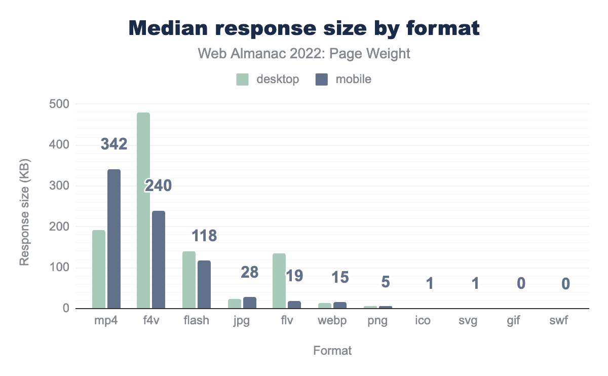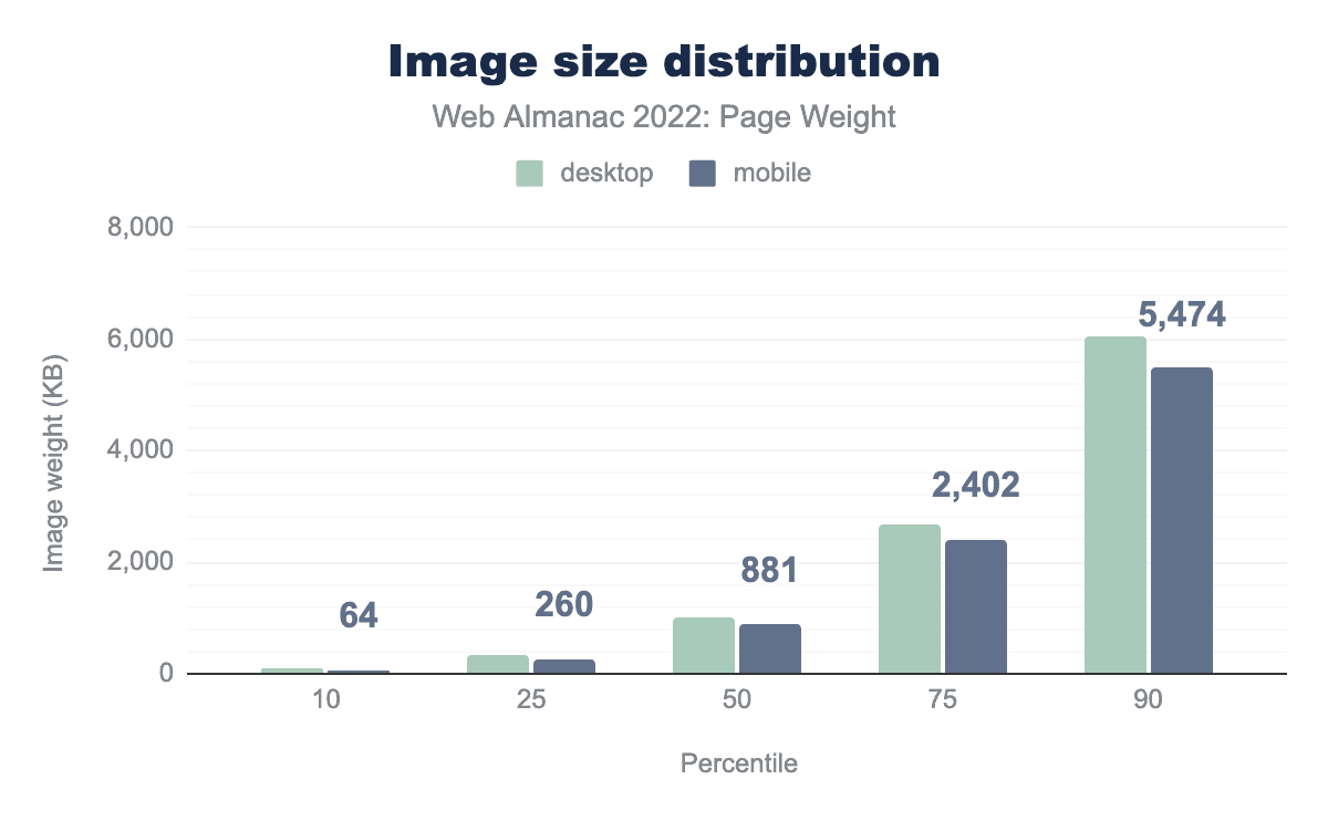 2022年のデスクトップの画像の中央値重量は1,026キロバイトで、2021年からわずか44キロバイトの増加でした。モバイルは881キロバイトでほとんど変わりませんでした。