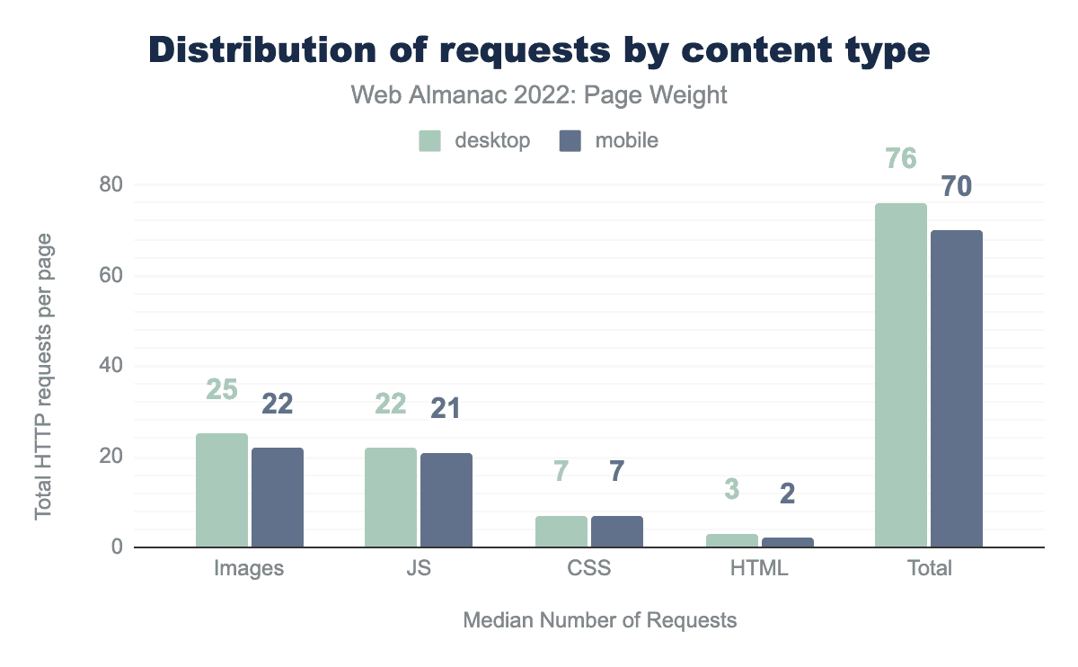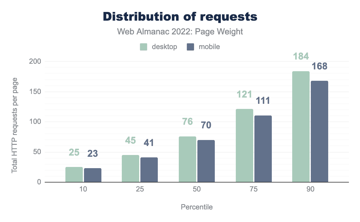 中央値(50パーセンタイル)のページでは、デスクトップページのロードには76のリクエストがあり、モバイルでは70のリクエストがあります。すべてのパーセンタイルでデスクトップとモバイルの差はほとんどありません。