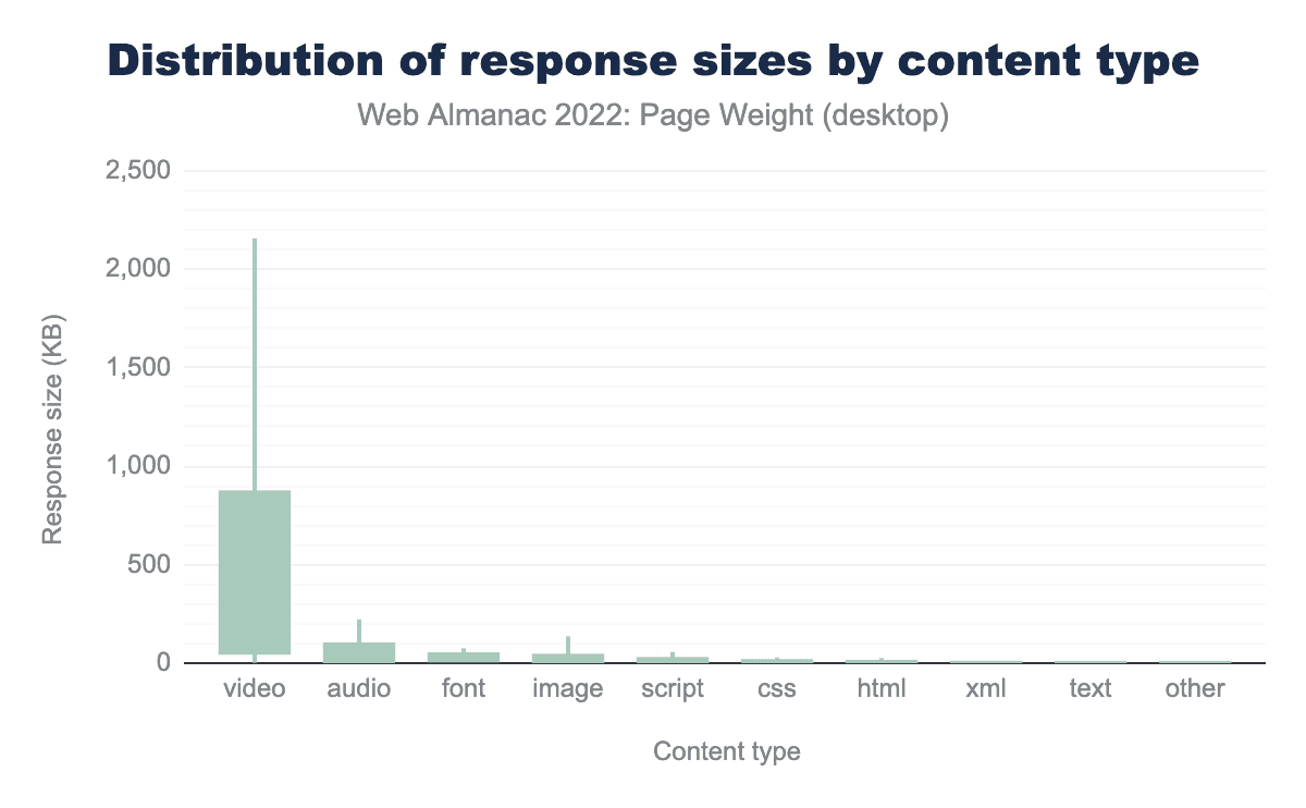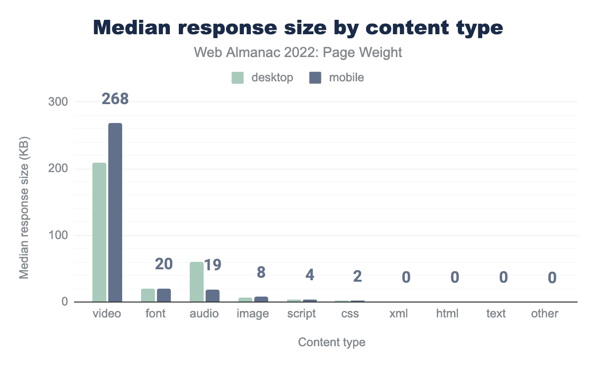画像とJavaScriptは依然としてバイトサイズの最大の貢献者である一方で、2022年はモバイル上でのバイト重視のビデオの増加や、画像のカウンターパートよりも中央値のフォントバイトサイズが高いといった驚くべき増加が明らかになりました。